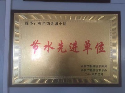 近期,在鄠邑區水務局舉辦的“中國水周”啟動儀式上,有色鉑金城小區被授予“節水先進單位”稱號。這一榮譽的獲得,是對有色鉑金城小區在重視水資源保護,積極倡導節約用水方面工作的一大肯定。